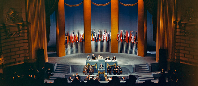 中国、ソビエト連邦、イギリス、アメリカの代表が1944年にワシントンD.C.に集まって行った審議に続き、翌年の1945年、50カ国の代表が「国際機関に関する連合国会議(United Nations Conference on International Organization)」に出席するためにサンフランシスコに集まった。