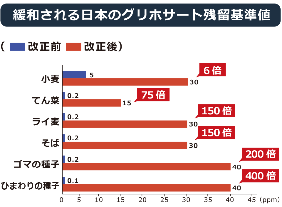 | グリホサートを取り込みたくない!「コープ自然派」 世界中で最も使われている除草剤の主成分「グリホサート」。 「ラウンドアップ」などの商品名で、農地のほか、公園や校庭、街路樹、駐車場などでも散布され、ホームセンターなどでも販売されています。 グリホサートは1970年代にアメリカで開発されて以降、世界で大量に使い続けられていますが、人体や環境への悪影響が次々と明らかになるにつれ、世界では規制強化が進んでいます。 しかし、日本は逆に規制を緩和。 世界の流れに逆行しています。 ![]() コープ自然派では食の安全性を軽視した政策の早急な見直しを求めています。 また、独自の商品取扱基準を設けるとともに、組合員さんご自身で毎日食べるものを「選べる」ように、農薬の使用状況などをマークにして商品案内(カタログ)に記載。 わたしたちが、毎日食べるものがどのように作られているのかをきちんと知って「買わない」・「食べない」意思表示することが、企業、そして社会を動かすことにつながっていきます。 グリホサートは発がん性物質 グリホサートの危険性が注目されるようになったのは、2015年に、WHO(世界保健機関)の外部組織である国際がん研究機関(IARC)が「発がんのおそれあり」と評価したことからでした。 ![]() IARCのランク付けは1~4の4段階で、2はAとBの2つに分けられます。 2Aは実験動物での十分な証拠があるものであるのに対して、2Bは実験動物での証拠がまだ十分でないものという違いがあり、2Aにランクされると発がん性が強く疑われることになります。 人体への健康被害明らかに 2018年8月、アメリカ・カリフォルニア州のサンフランシスコ地裁は、「がんになった原因は除草剤『ラウンドアップ』(主成分:グリホサート)によるものだ」と訴えていた末期がんの原告の男性に、それを認め、農薬メーカーのモンサント社(現バイエル社)に2億8900万ドル(約320億円)支払うように命じました(後に7800万ドル(約87億円)に減額)。 学校の用務員だった原告は、校庭に「ラウンドアップ」のジェネリック製品を繰り返し散布していました。 同様の訴訟がアメリカでは数万件に増えています。 グリホサートは「毒性が低い」「環境にやさしい」と開発企業のモンサント社は宣伝してきましたが、最近の研究で、発がん性、神経毒性、生殖や出産への影響、世代を超えて受け継がれる影響を指摘するものが続々と発表されています。 (デトックス・プロジェクト・ジャパンのホームページにリンクします) また、モンサント社はグリホサートは植物がアミノ酸を作り出すシキミ酸経路をブロックすることで除草効果を発揮するため、シキミ酸経路をもたない動物や人間に影響ないと説明してきました。 確かに、動物や人間にシキミ酸経路はありませんが、動物や人間の腸内にはシキミ酸経路をもつ腸内細菌が棲んでいます。 グリホサートの影響で腸内細菌を損なうと、そこからさまざまなアレルギー、自己免疫疾患などの原因になることが指摘されています。 ![]() 人の体内にグリホサートが残留!? どのように入ってくるの? 世界的にグリホサートの有害性が注目されるようになり、人体汚染の調査が進んでいます。 2015年に有機消費者協会とカリフォルニア大学サンフランシスコ校の協力を得て、アメリカで初めて尿の検査をしましたが、その際、採取した尿の93%からグリホサートが検出されています。 日本でも、グリホサート禁止を目指す市民グループ「デトックス・プロジェクト・ジャパン」(2019年5月発足)がグリホサートの人体汚染の調査を始めることとなり、その先駆けとして、国会議員23人を含む28人の髪の毛の検査を実施。 うち7割にあたる19人の毛髪からグリホサート(グリホサートの分解生成物であるAMPA含む)が検出されました。 「デトックス・プロジェクト・ジャパン」では、人体汚染の実態を明らかにするための検査を呼びかけており、コープ自然派でも組合員より検査希望者を募っています。(2020年1月募集※/2020年11月募集) ※2020年1月の募集は、試験手法の標準化と最適化を進めるためにやむなく中止になりました。 では、グリホサートはどのように体内に入ってくるのでしょうか? グリホサートを体内に取り込む経路①食べもの 1990年代半ばに「遺伝子組み換え(GM)作物」が開発され、栽培面積は2018年現在、世界の農地の13%※を占めるほどになっています。 また、付加された形質別にみると、「除草剤耐性」の形質を持つものが約46%、「害虫抵抗性」の形質を持つものが約12%、除草剤耐性と害虫抵抗性の両方の形質を持つものが約42%です。 ※出典:国際アグリバイオ事業団(ISAAA) 除草剤耐性のGM作物は、グリホサート等を分解する酵素が遺伝子に組み込まれています。 ![]() 日本は世界でもトップクラスの遺伝子組換え(GM)作物の消費国で、大豆・とうもろこし・ナタネなどのほとんどを、GM作物の栽培が盛んなアメリカ・カナダから輸入し、食用油や家畜の飼料として使用しています。 ![]