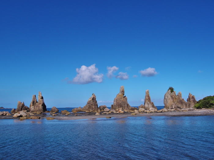 | 本州最南端に位置する和歌山県串本町。 ここには不思議な景観が楽しめる観光スポット『橋杭岩』があります。 沖に浮かぶ大島に向かって海の中を約850mに渡り、一直線に大小40余りの奇岩が立ち並んでいて、他では見ることのできない不思議な光景を楽しむことができます。 車の中から眺めるのではなく、目の前に広い駐車場がありますので車を停めて、車から降りて歩いて散策してください。 潮が引いていたら岩まで歩いて行くことができますよ。 |
