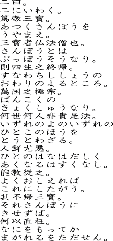 | 現代語訳 三宝を篤く敬え。 三宝とは仏・法・僧である。 この三宝はすべての人が最期の最期に行き着くところであり、国家があるなら必ず根本とするものである。 何時の世にも誰でもこの三宝を敬わないことがあろうか。 そもそも極悪人は少ないので、ちゃんと教えればちゃんと三宝に従うものである。 三宝に帰依せずにひねくれ曲がった者や悪事を犯そうとする者をどのように糺すのであろうか。 釈 一条と二条は切って切り離せない関係にある。 一条にある「真理を知る者は稀である」の「真理」とはまさしく二条の「三宝」に他ならない。 この「三宝」へ帰依してこそ初めて「和睦」が実現するのである。 国家とは、土地を得て人が集まり、法(律)を定めたところに存在する。 逆に言えば、土地があり、そこに人々が住み、その人々で法律を定めれば、それはすなわち国家である。 国家とは人々の集団の最大単位である。 また最小単位は「家族」である。 あるいは会社という組織においても、その所有地があり、そこにその会社員が存在し、その会社の規則があれば、それはそれで1つの「国家」と言える条件が揃う。 第一条にある「君父」の「君」とは集団生活における最大単位の主である「国主」であり、「父」とはその最小単位の主である「家主」のことである。 会社においてはその主は「社長」にあたろう。 すなわち最小単位である「家族」から始まり、会社や様々な組織を通し、その最大単位である「国家」に至るまで、上の者と下の者は存在する。 この「法」の根本に「三宝」を置かなければならない。 逆にいえば、「三宝」を根本として、その上に法律が存在するものである。 この「三宝」を根本として議論するのであれば、自然と道理に適い、何事もなさないことはない。 主君や親など上に立つ者に対する反発心を抱くような者や隣人との争いを犯すような者も、最初から悪人であったわけではない。 このような者を正すのは「三宝」に依るしかない。 また、三宝に依るならば、たとえ悪人であろうとも、それが活かされてくるものである。 生命の根本の法を知るとき、すなわち三宝に帰依するとき、正と邪が定まる。 何が正で何が邪であるかがはっきり立て分けができるようになったとき、それを基として各々自由を得る。 そのとき「和」が実現するのである。 聖徳太子が釈尊の弟子だったという立場であればこそ顕わされる一条である。 |